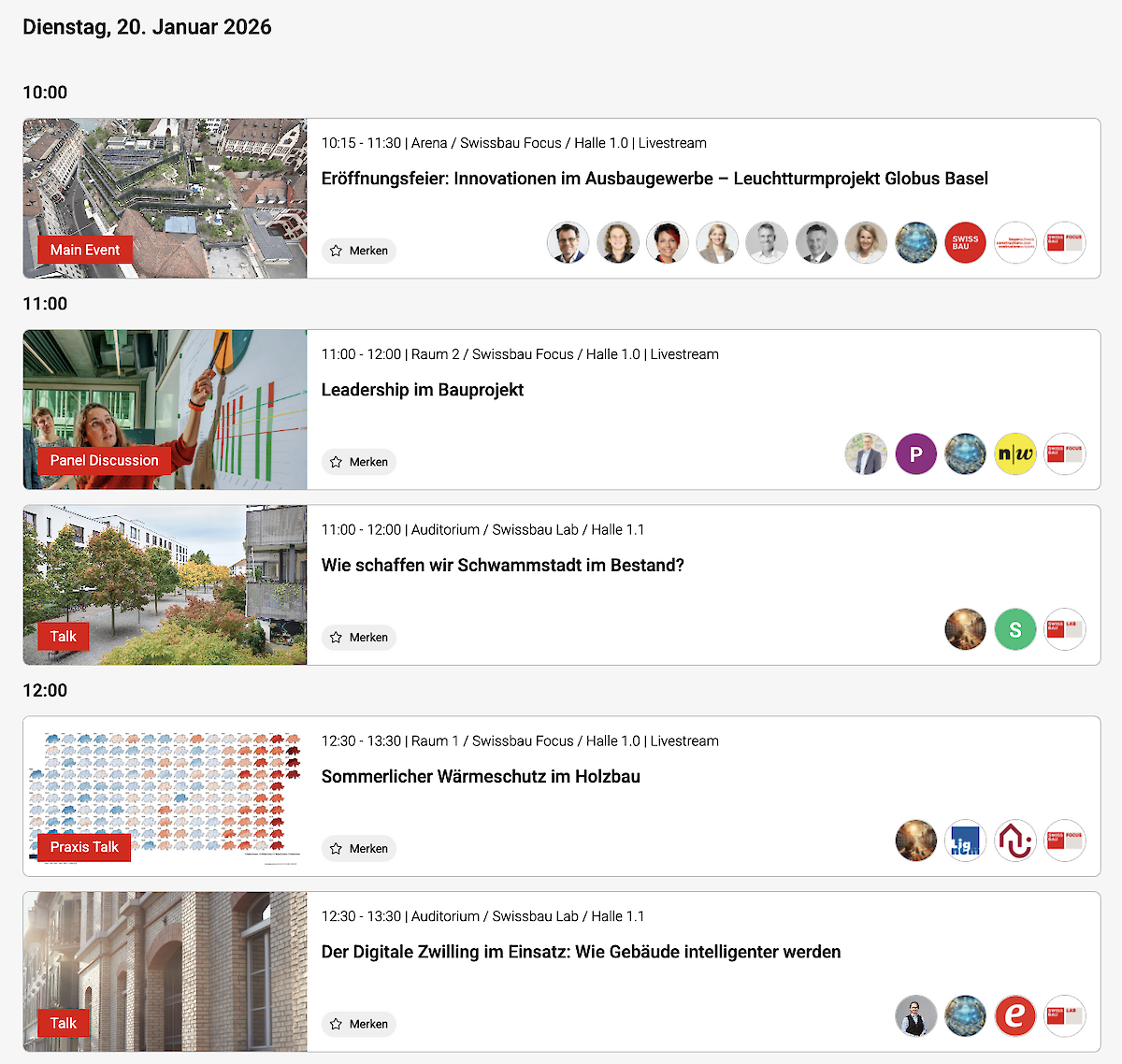 Seien Sie dabei an der Swissbau vom 20. bis 23. Januar 2026, wenn die Branche neue Impulse setzt, entdecken Sie das vollständige Programm im Veranstaltungskalender und melden Sie sich dort zu Ihren favorisierten Anlässen an. Mit Ihrem Messeticket erhalten Sie Zugang zu allen Veranstaltungen vor Ort und online. Und mit dem Prio-Code «sb26-IEU» können Sie sich im Ticketshop der Swissbau eine kostenlose Tageskarte für die Swissbau 2026 sichern.