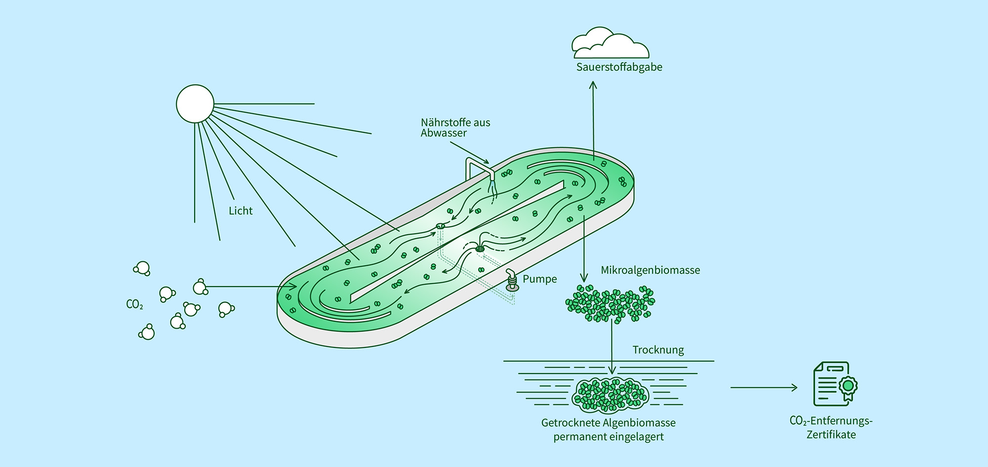 Die Arrhenius AG setzt auf einen seit Jahrmillionen bewährten Prozess: die Photosynthese von Mikroalgen. Diese binden CO₂ aus der Luft und nutzen es zur Biomasseproduktion. Die Biomasse wird anschliessend getrocknet und dauerhaft im Untergrund gespeichert.